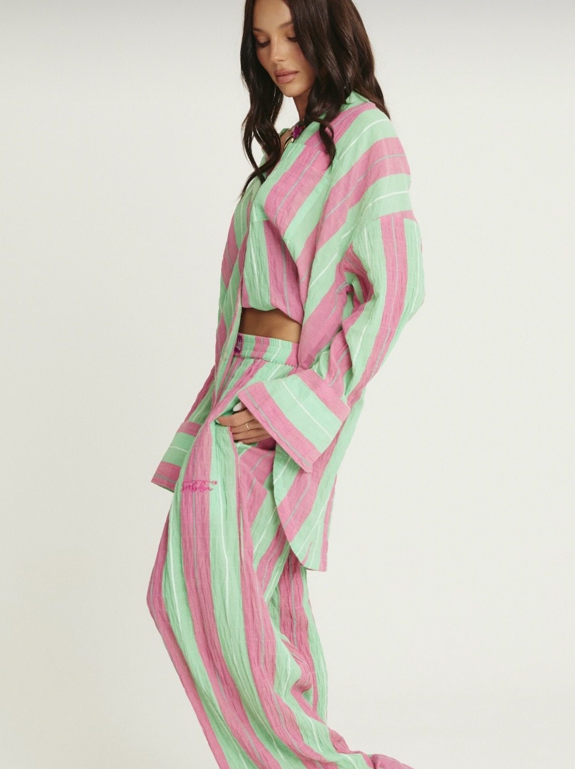 Designed in juicy stripes, she’s made from lightweight crinkle cotton that moves effortlessly and feels breezy from brunch to beach to bar.