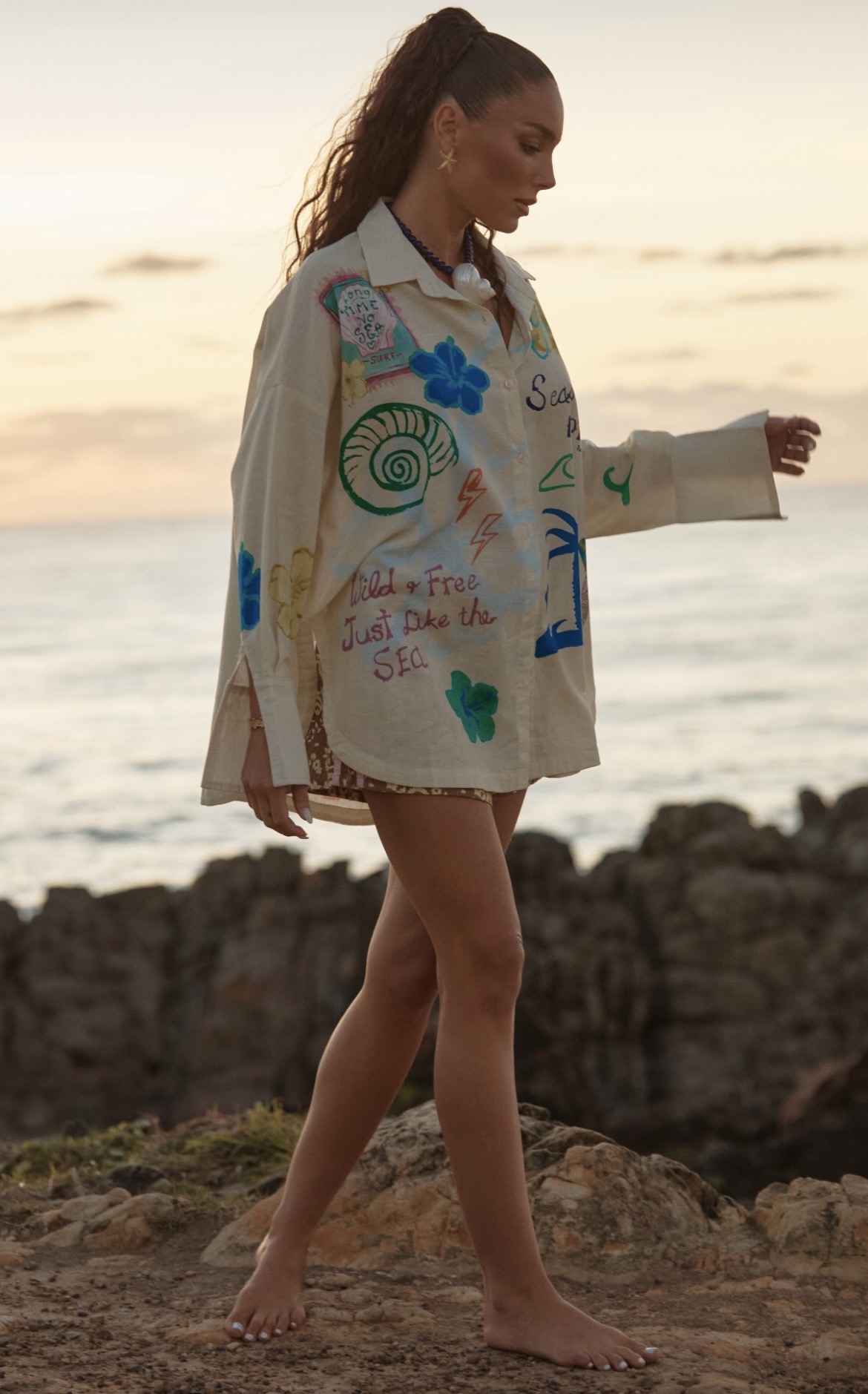 Featuring bold, hand-drawn Seas The Day artwork across the fabric, this long sleeve button-up brings together mermaids, shells, suns and scribbled details in true Sabbi style. Cut in an easy, loose fit and crafted from a lightweight, breathable fabric, its perfect worn open, softly buttoned or thrown on when the sun dips.