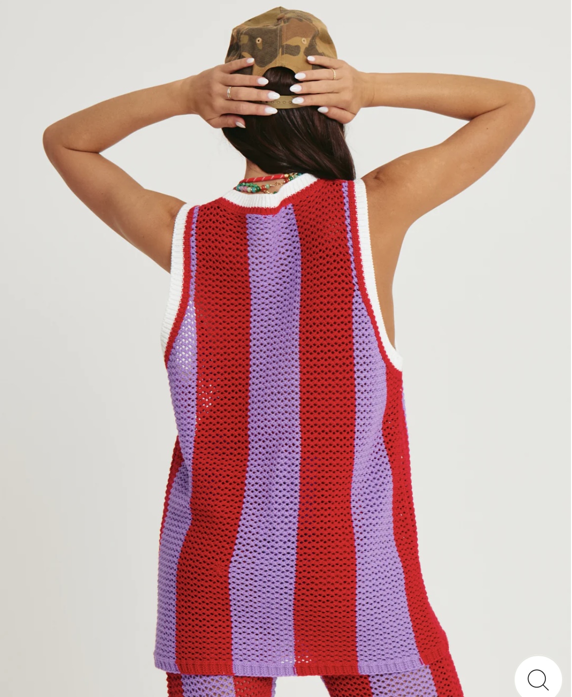 Meet The Knit B-Ball Singlet – the retro-sporty, festival-ready, sunshine-loving top that brings instant main-character energy. Boasting bold stripes, this breathable open-knit tank is the perfect mix of playful and nostalgic.