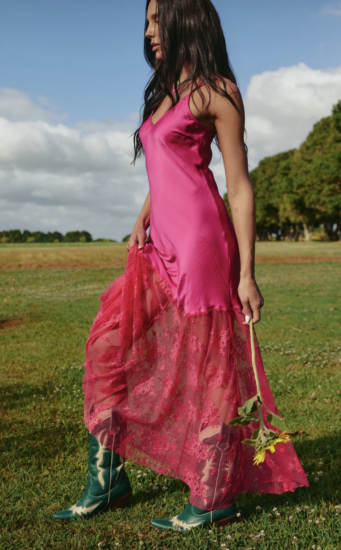 The bias-cut satin skims the body, while the lace hem keeps things playful and romantic. It’s made for sunshine, dancing, and that “I just threw this on” kind of confidence. Whether you’re barefoot at the beach or stomping in boots, she’s guaranteed to turn heads.