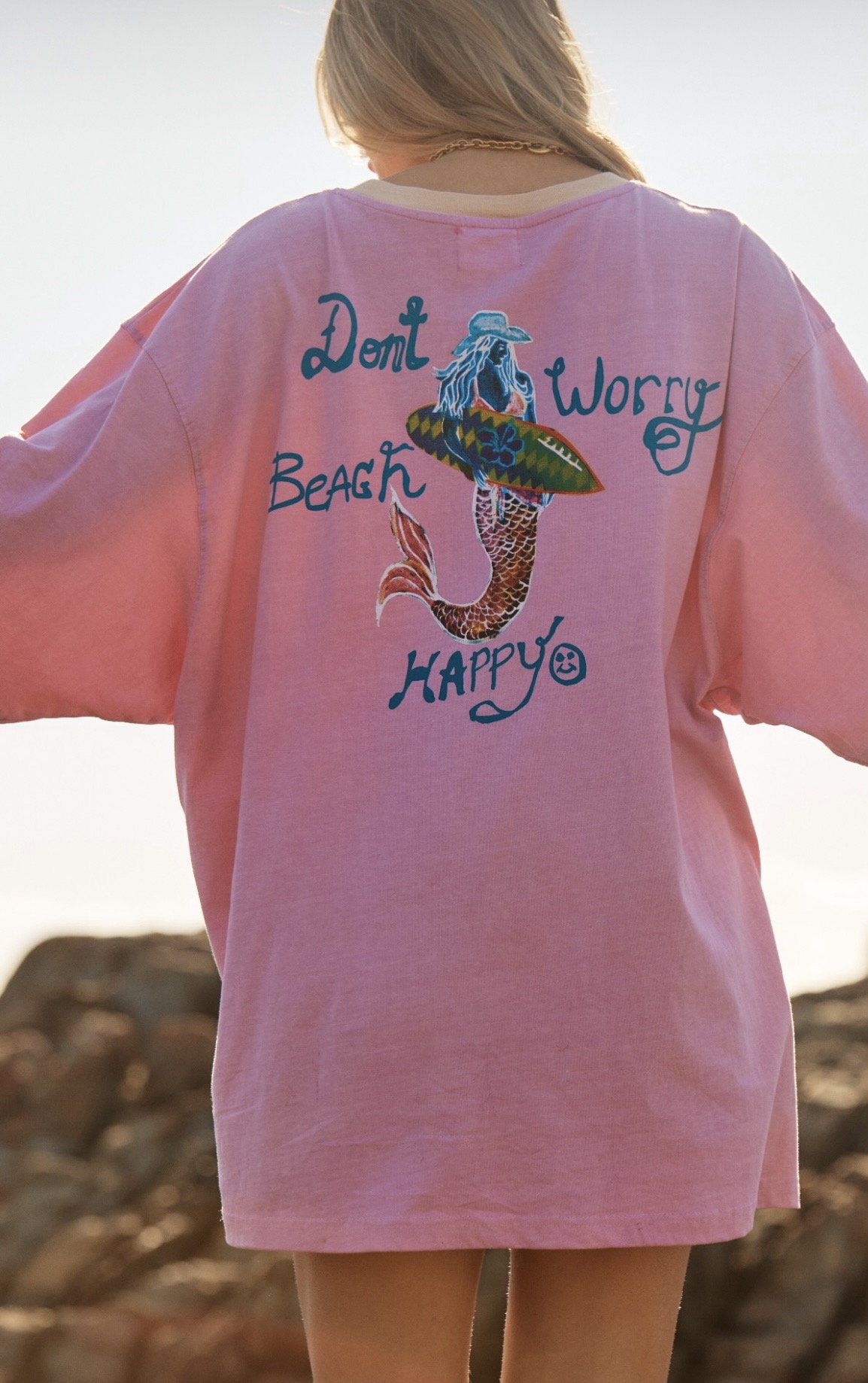 Cut in a very oversized, ultra-relaxed fit, this tee features playful, hand-drawn shell artwork on the front and a statement mermaid graphic on the back – because coastal chaos is a lifestyle. Made from soft, breathable cotton, its perfect thrown over swim, worn as a tee dress or styled messy-cute with bikers. Zero effort. Maximum seaside sass.